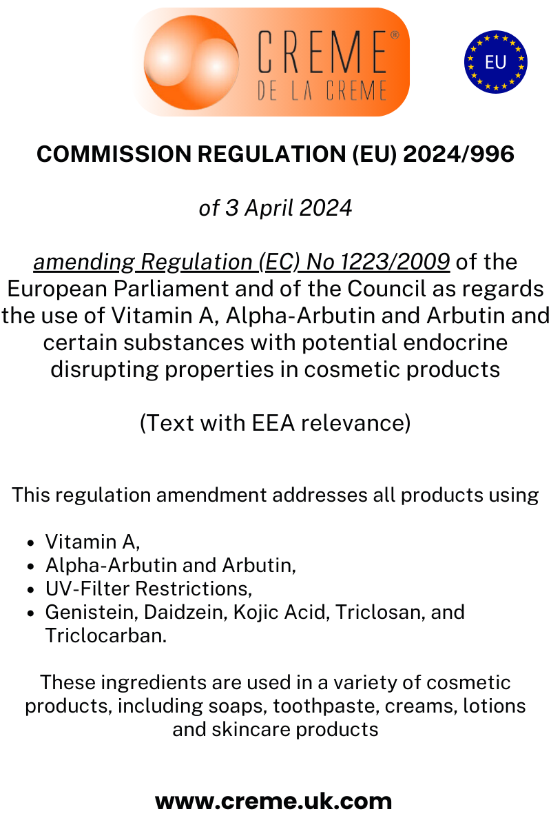 At Crème de la Crème, we are here to support you in complying with COMMISSION REGULATION (EU) 2024/996, which amends Regulation (EC) No 1223/2009 to remove the regulatory jargon; our experts will ensure that your products are compliant in the EU, UK, USA and Rest of the world!